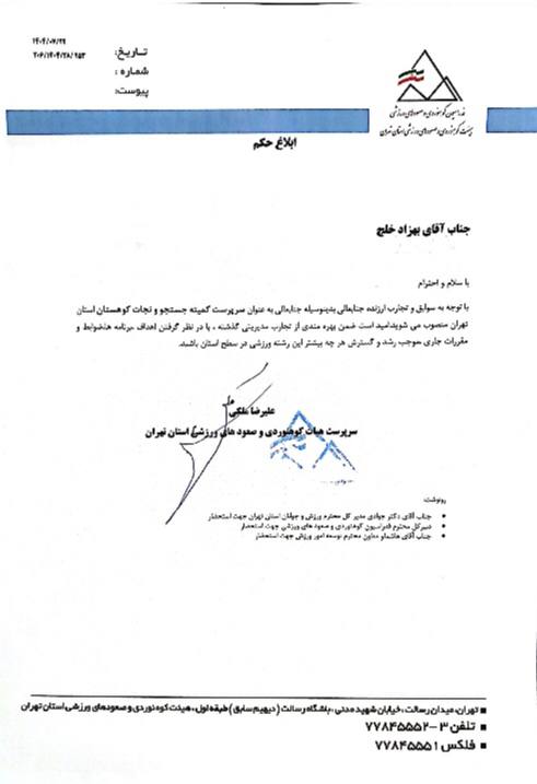 طی حکمی توسط آقای علیرضا ملکی، سرپرست هیئت کوهنوردی و صعودهای ورزشی استان تهران، آقای بهزاد خلجی، از اعضا و مربیان باشگاه کوهنوردی تهران و مسئول فعلی کمیته فنی باشگاه کوهنوردی تهران، به سمت «مسئول کمیته پیشگیری از حوادث کوهستان استان تهران» منصوب شد.