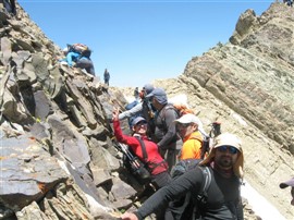 9:30 دقیقه برای 5 دقیقه خیلی کوتاه استراحت کردیم. ساعت 10:20 به گردنه ورزا (به ارتفاع 3964 متر) رسیدیم و برای 20 دقیقه در آنجا استراحت کردیم. ساعت 10:40 نفر سومی که بالای آبشار از گروه فاصله گرفته بودند به گروه ملحق شدند. از روی گردنه بخوبی قله برج، قلل خلنو و تیغه های ژاندارک قابل رویت است. بعد از گردنه برای صعود قله دو مسیر وجود دارد. مسیر کفی سمت شرق گردنه (موسوم به کاسه خلنو) که پاکوب مشخصی دارد و تا زیر قله پیش میرود و با یک شیب زیاد به سمت شمال به قله میرسد و در واقع قلهی برج و خلنو اول یا خلنو گوچک را صعود نمیکند. مسیر دوم مسیر قله برج، قله خلنو کوچک و قله خلنو است و مسیر صعود به قله برج شیب مسیر بیشتر میشود و بافت سنگی ناهمگون دارد که نیازمند کمی دقت در گامبرداری است. گروه مسیر قله برج را پیش گرفت البته یکی از همنوردان به همراه یکی از همنوردان باتجربه از ادامه مسیر منصرف شدند و تصمیم گرفتند روی گردنه منتظر برگشتن گروه بمانند. ساعت 11:40 دقیقه زیر قله برج گروه برای 10 دقیقه استراحت کرد و ساعت 12:00 به قله برج (به ارتفاع 4307 متر) رسید. گروه ابتدا از یال شمالی در مسیر سنگی کمی فرود داشت و بعد از تراورس و گذراندن رگههای سنگی مسیر و با عبور از زیر تیغه های ژاندارک به سمت قله حرکت کرد. بدلیل اینکه تعداد همنوردانی که مایل بودند از مسیر تیغه های ژاندارک قله را صعود کنند زیاد بود مربی و مسئول فنی برنامه تصمیم گرفتند برای اینکه روحیه تیم مخدوش نشود، کل گروه از یک مسیر حرکت کند و صعود از این مسیر کنسل گردید. در مسیر تراورس زیر تیغههای ژاندارک شیب مسیر زیاد است و بدلیل ریزشی بودن سنگهای آن لازم است گروه با احتیاط و منسجم حرکت کند و فاصله بین اعضای گروه به حداقل برسد. همچنین هنگام تراورس مسیر باید بسیار دقت شود که هنگام فرود ارتفاع زیادی را پایین نرویم چرا که با شیب تند مسیر؛ برگشتن به بالا و رسیدن به خط الراس سخت خواهد شد. ساعت 13:30 دقیقه بعد از اتمام تراورس مسیر؛ بین قله خلنو بزرگ و خلنو کوچک برای 5 دقیقه توقف کردیم و در اینجا یکی از همنوردان بدلیل سرما خوردگی از ادامه مسیر منصرف میشوند و یکی از همنوردان تا برگشت گروه از قله ایشان را همراهی کردند. ساعت 14:00 گروه به اتفاق 22 تن از همنوردان قله خلنو (به ارتفاع 4375متر) را صعود کرد. روی قله یادبود مرحوم ابراهیم شیخی نصب شده بود. تعداد زیادی از کوهنوردان روی قله بودند و در کل مسیر و قله شلوغ بود. گروه پس از گرفتن چند عکس یادگاری بلافاصله قله را ترک کرد و به سمت مسیر شن اسکی که بین قله خلنو بزرگ و خلنو کوچک به کاسه خلنو منتهی میشد حرکت کردیم. ساعت 14:15 برای نهار روی خطالراس بین خلنو بزرگ و کوچک، بالای مسیر شن اسکی (به ارتفاع 4302متر) به مدت 30 دقیقه توقف کردیم و بعد از آن از مسیر شناسکی به سمت جنوب حرکت کردیم. در این منطقه هنوز برفهای آب نشده باقی مانده بود و در اولین برفچال که شیب زیادی هم داشت یکی از همنوردان روی برف سر خورد و خوشبختانه روی برف ترمز کرد و آسیب ندید. بار دیگر ضرورت گذراندن دوره های کارآموزی و علت حساسیت ها و قوانین باشگاه برای شرکت در برنامه های رسمی تقویم ورزشی مشخص گردید. ساعت 15:15 پس از عبور از مسیر پر شیب به کاسه خلتو رسیدیم، در این قسمت برف زیادی هنوز وجود داشت، برای 10 دقیقه گروه استراحت کرد. بعد از آن پس از عبور از کمی سربالایی به گردنه ورزا رسیدیم، پس از پیوستن دو همنورد به گروه و استراحتی کوتاه گروه از همان مسیر صعود، مسیر برگشت را پیش گرفت. ساعت 16:45 به چشمه دوم بالای آبشار رسیدیم پس از توقفی کوتاه و برداشتن آب به مسیر خود ادامه دادیم. 17:15به گوسفندسرای بالای آبشار رسیدیم و دو همنوردی که در آنجا منتظر گروه بودند به ما پیوستند و پس از 20 دقیقه استراحت در کنار رودخانه به حرکت خود ادامه دادیم. 18:20برای 20 دقیقه در کنار یک نهر آب استراحت کردیم.